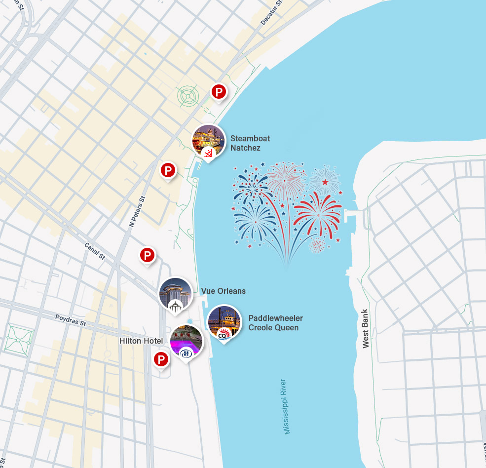 The Port of New Orleans will bring out the General Roy S. Kelley fireboat again this year with its famed water show with plumes of red, white, and blue fountains from 6:30 - 7 pm.